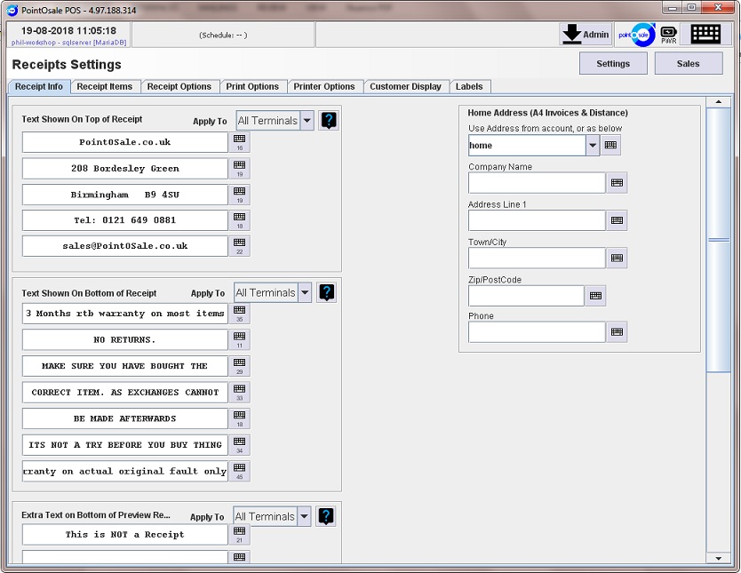All your receipt settings, pictures, addresses, text sizes and templates are in the same section